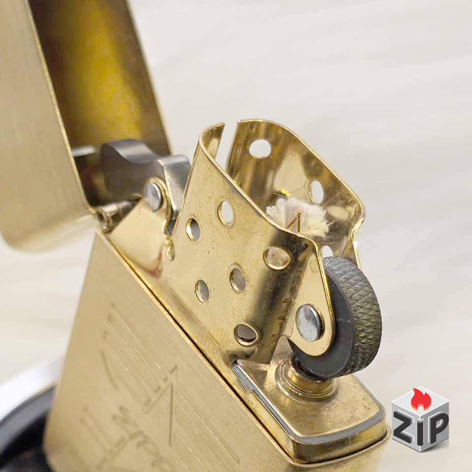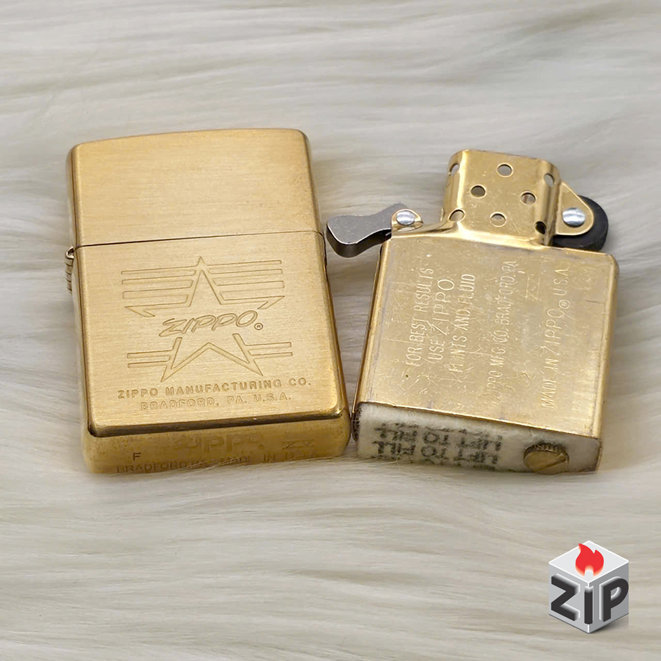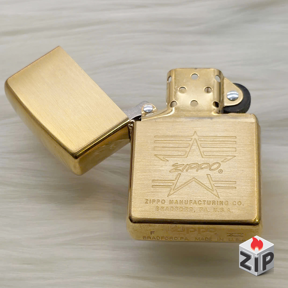 - Kiểu dáng: Zippo tiêu chuẩn (đời la mã – 15 la mã/xv ở đáy), vỏ được giữ nguyên màu vàng đồng nguyên bản (brushed brass), tạo vẻ ngoài cổ điển và mạnh mẽ.