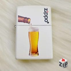 - Chi tiết: Hình in màu sắc rực rỡ, mô tả chân thực bọt bia và nước bia, cùng logo Zippo được in dọc ở góc trên.