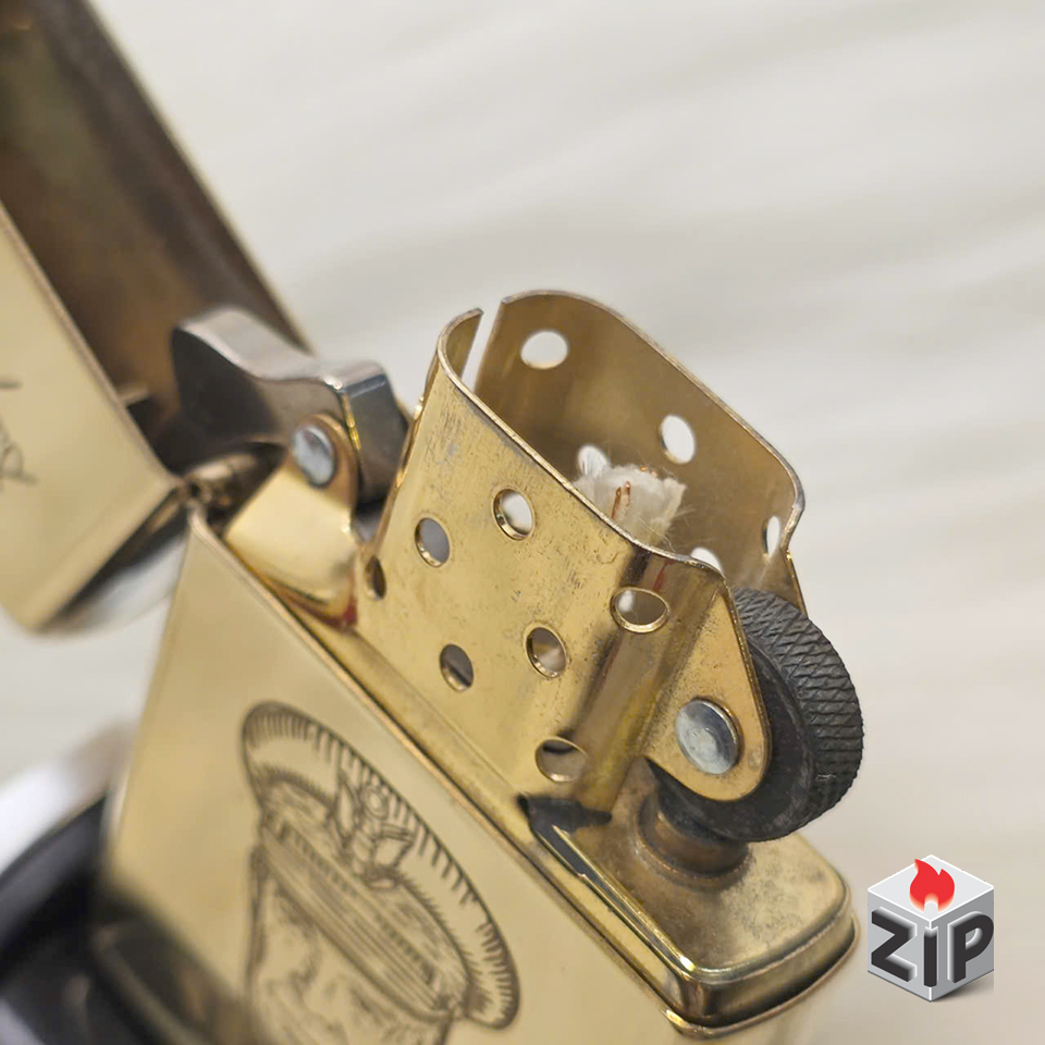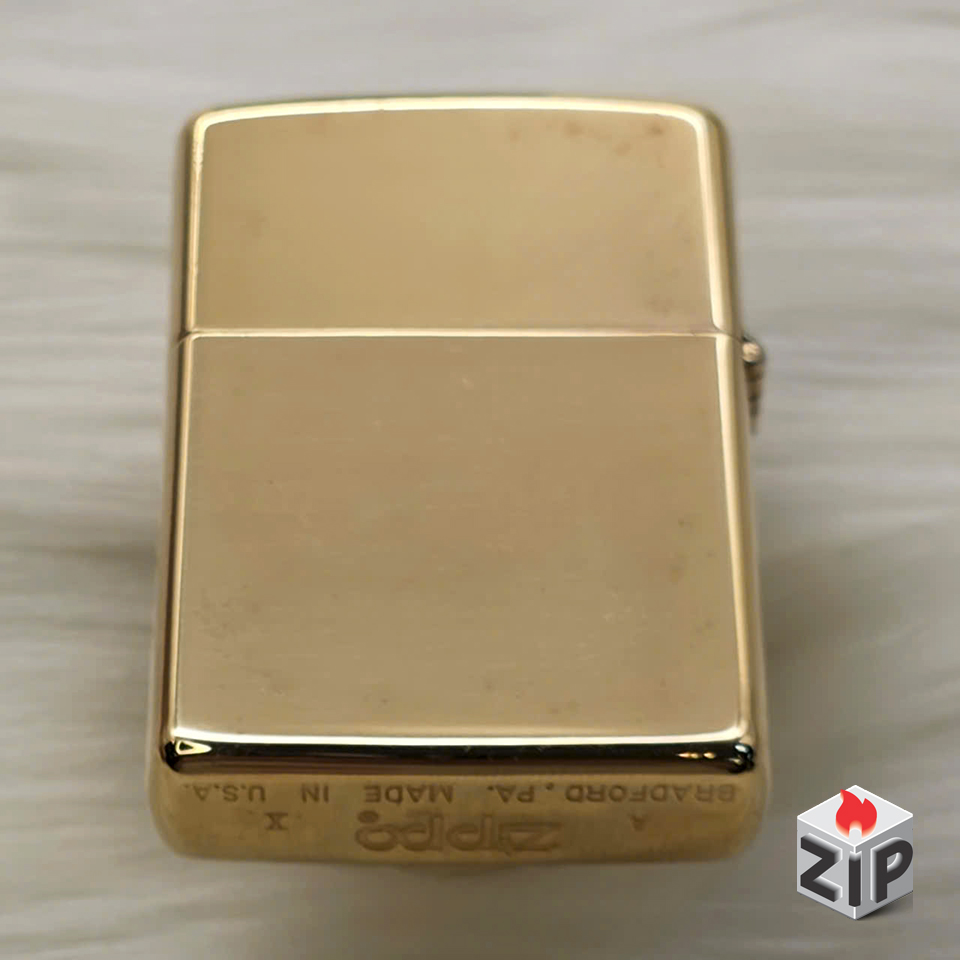 - kiểu dáng: Zippo tiêu chuẩn (đời la mã – 9 la mã/ix ở đáy), vỏ được giữ nguyên màu vàng đồng, bề mặt được đánh bóng cao (high polish), tạo vẻ ngoài sang trọng và trang trọng.