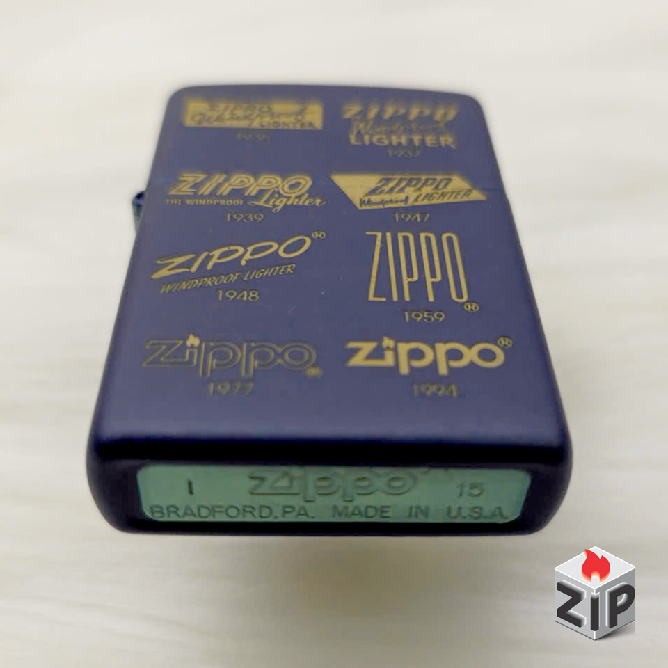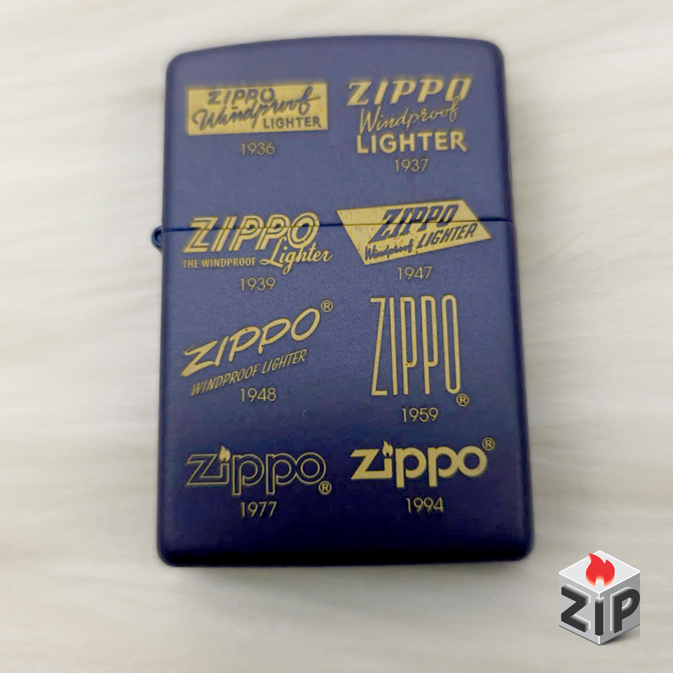 - Họa tiết: In hình ảnh tổng hợp các mẫu logo của Zippo qua từng giai đoạn lịch sử.