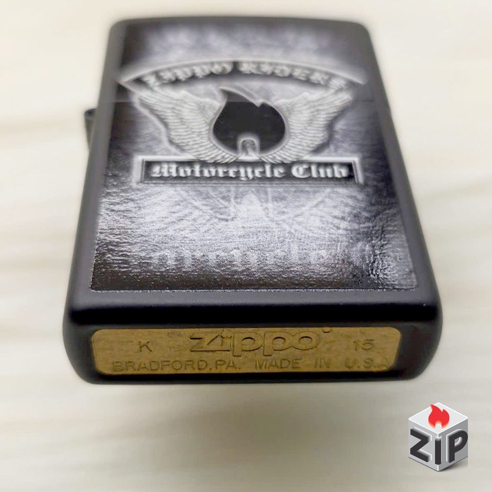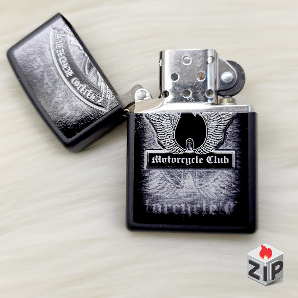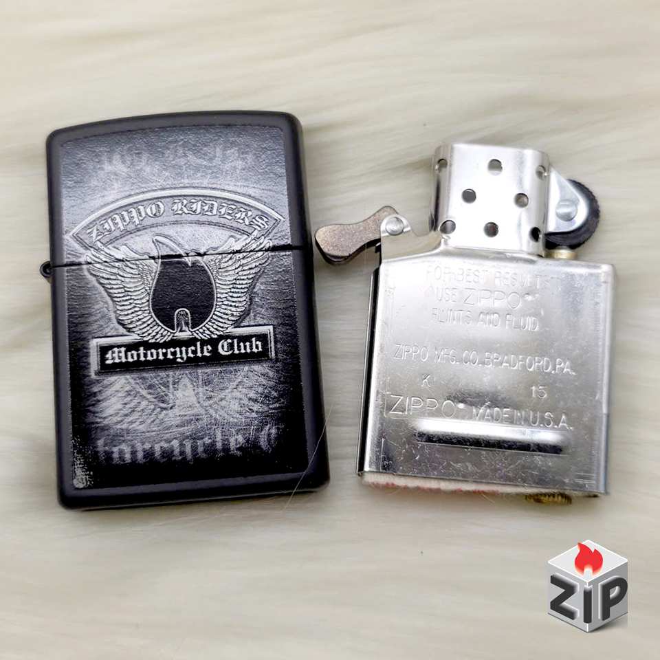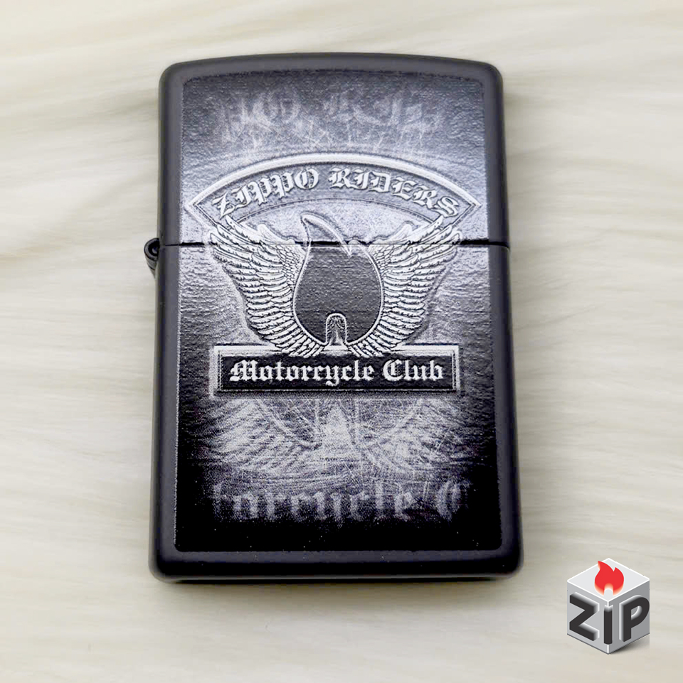 - Chữ: Khắc các dòng chữ như “ZIPPO RIDERS” và “Motorcycle Club”, tạo cảm giác như một biểu tượng của câu lạc bộ mô tô.