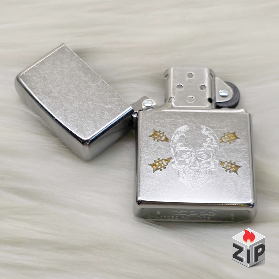 - Kiểu dáng: Zippo tiêu chuẩn, vỏ được xử lý bề mặt Xi Bụi (Satin/Stone Finish), tạo cảm giác lì, có độ nhám nhẹ và màu trắng bạc cổ điển.