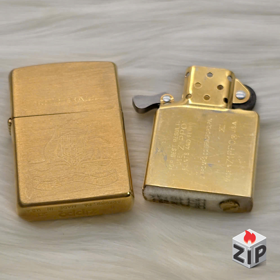 - Kiểu dáng: Zippo tiêu chuẩn (đời la mã – 11 la mã/xi ở đáy), vỏ được giữ nguyên màu vàng đồng nguyên bản, tạo vẻ ngoài cổ điển và sang trọng.