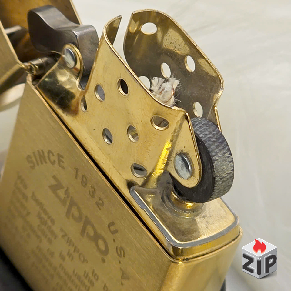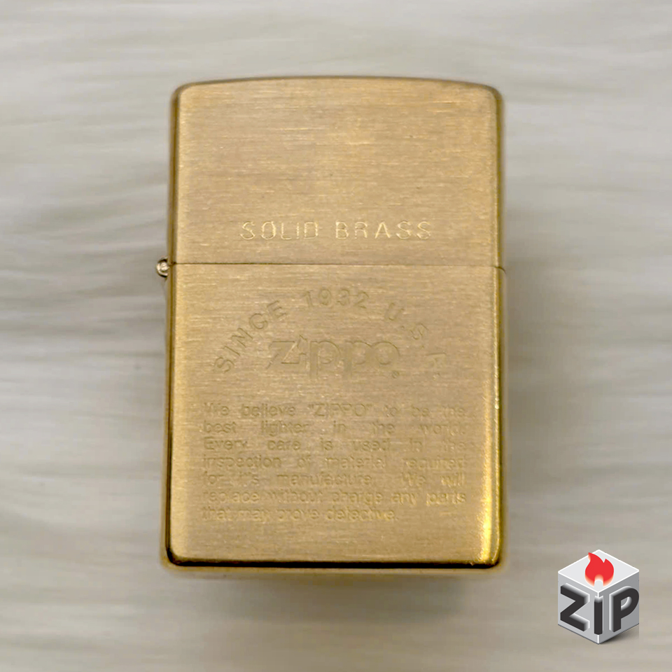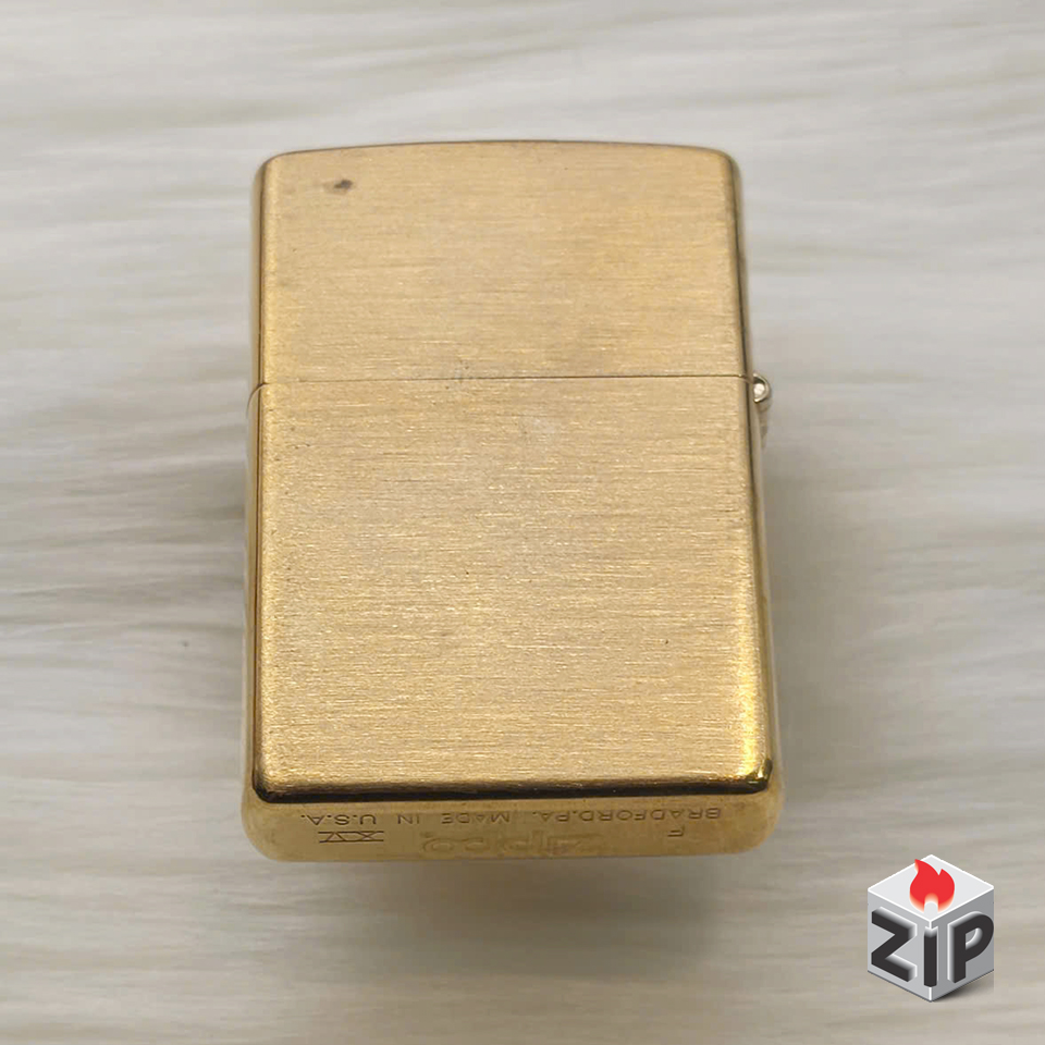 - Kiểu dáng: Zippo tiêu chuẩn (đời la mã – 15 la mã/xv ở đáy), vỏ được giữ nguyên màu vàng đồng nguyên bản (brushed brass), tạo vẻ ngoài cổ điển và sang trọng.