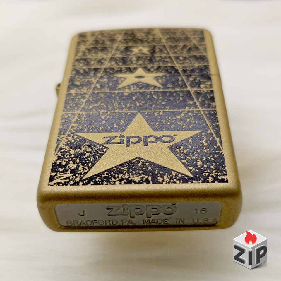 - Chi tiết: Ngôi sao lớn nhất ở phía dưới có logo Zippo ở trung tâm. Toàn bộ họa tiết được phủ hiệu ứng sần, hạt bụi màu đen/xám trên nền vàng, rất độc đáo.
