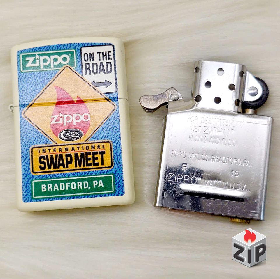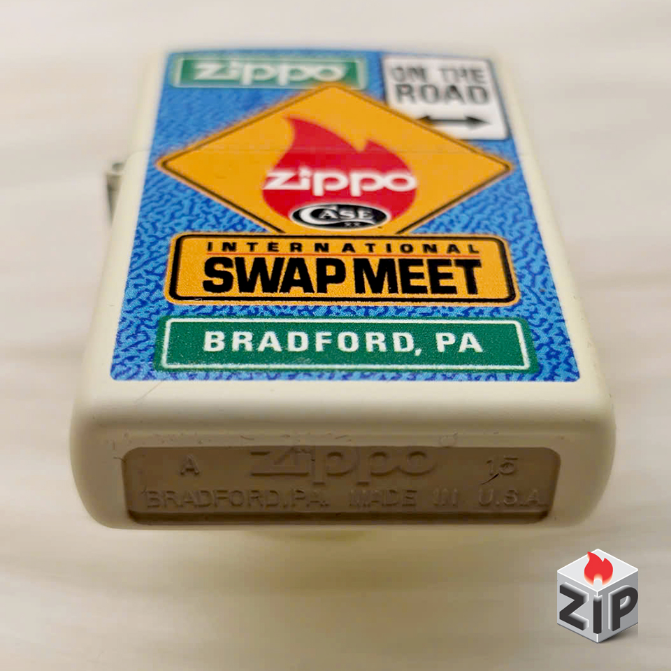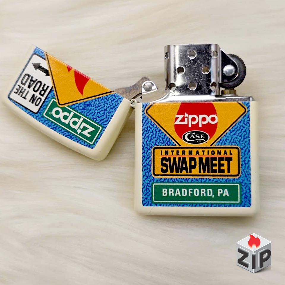 - Chữ: Khắc/in các dòng chữ nổi bật như “ZIPPO ON THE ROAD”, “INTERNATIONAL SWAP MEET” và địa điểm “BRADFORD, PA” (Trụ sở Zippo).
