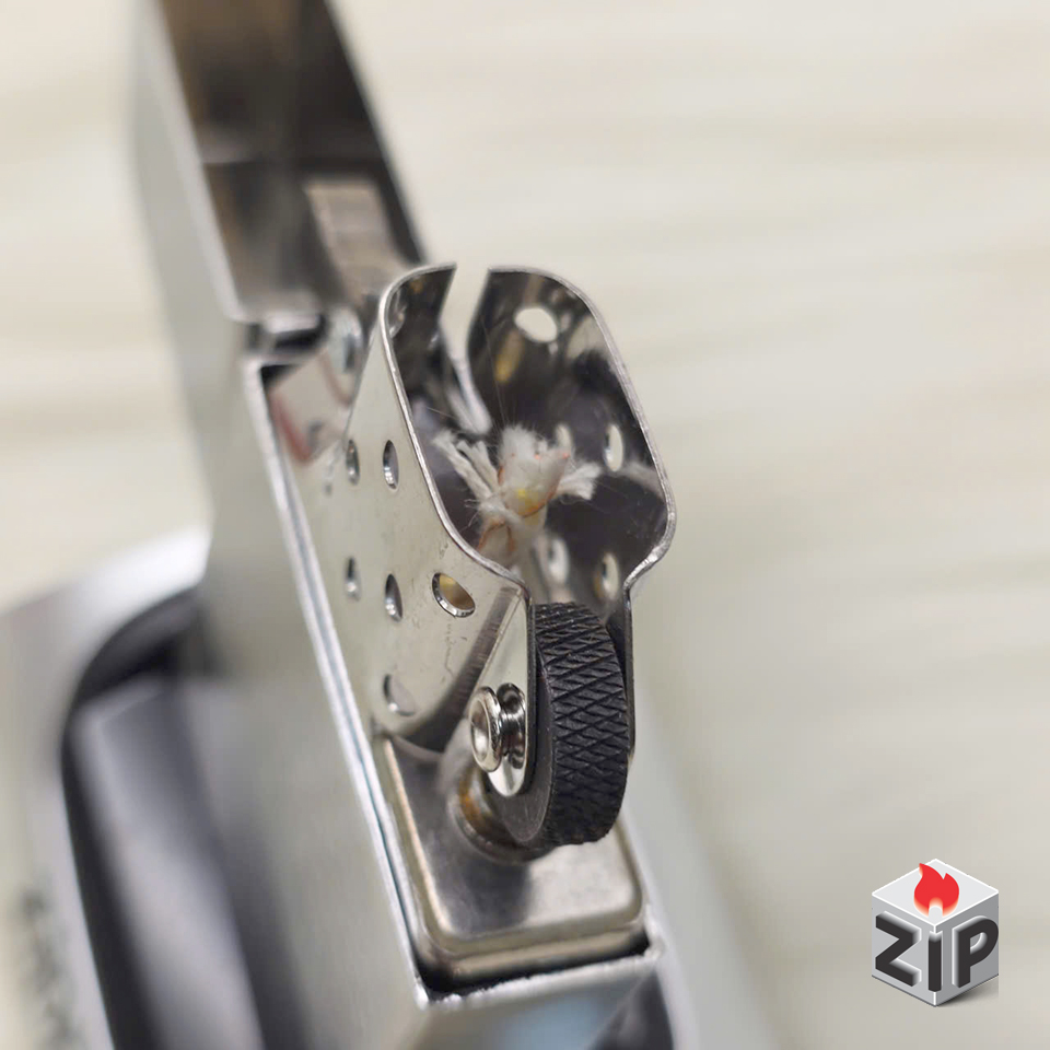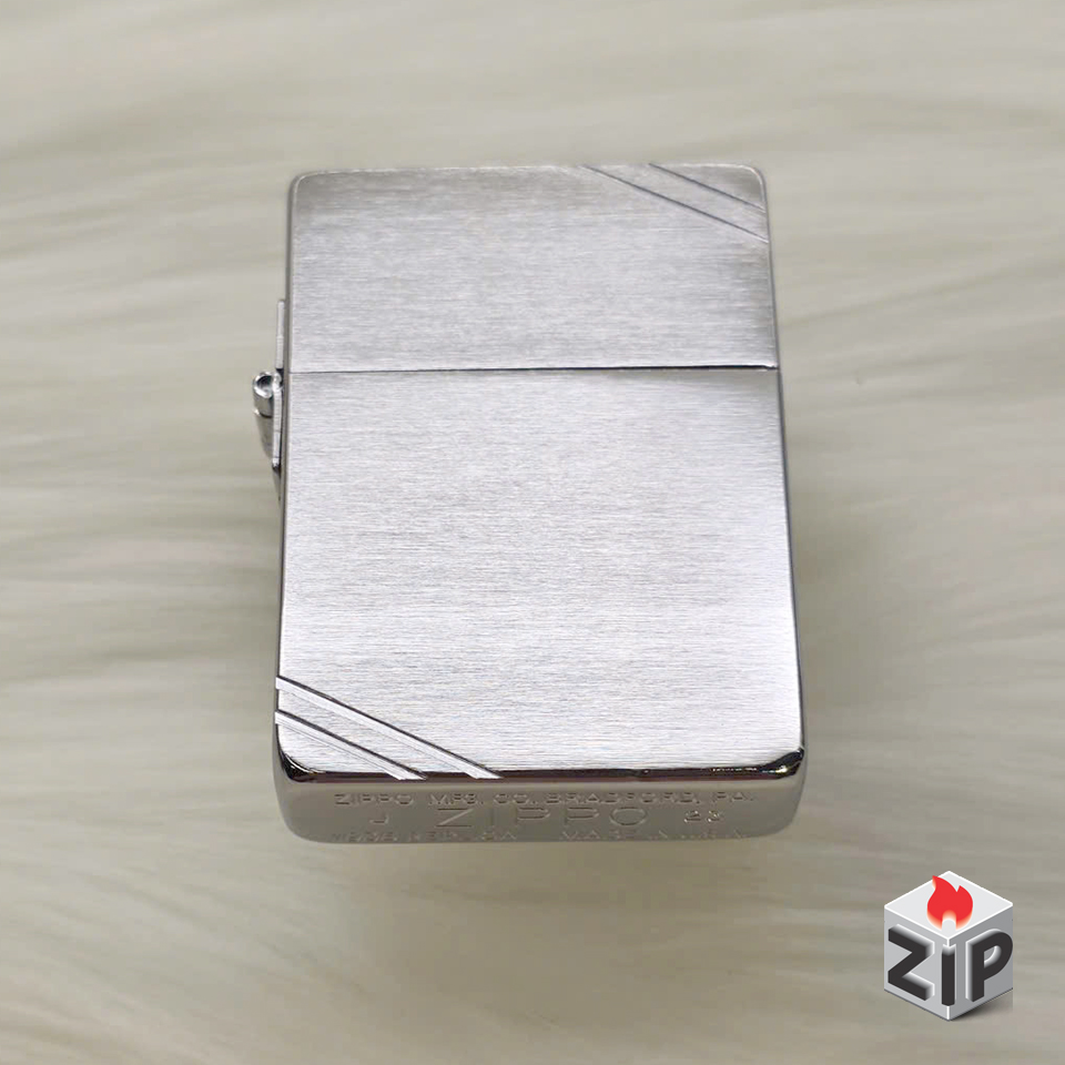 - Họa tiết: Vỏ được mạ Chrome và hoàn thiện bằng phương pháp Brushed Chrome (Chrome Xước), tạo vẻ ngoài cổ điển, bền bỉ. Điểm nhấn là hai đường khắc chéo (Slash Marks) tinh tế ở góc trên và góc dưới, mô phỏng lại chi tiết trang trí đặc trưng của Zippo nguyên bản 1935.