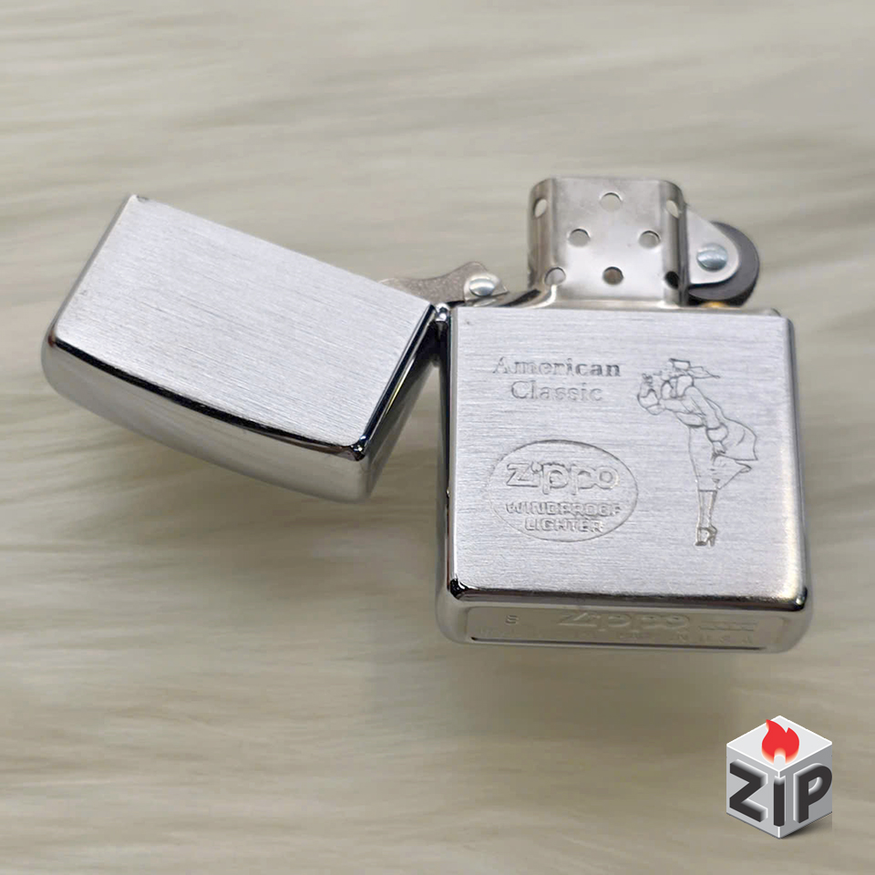 - Chủ đề: Khắc họa hình ảnh một cô gái quyến rũ đang thổi/châm lửa cho zippo, tượng trưng cho sự “windproof” (chống gió) của zippo.