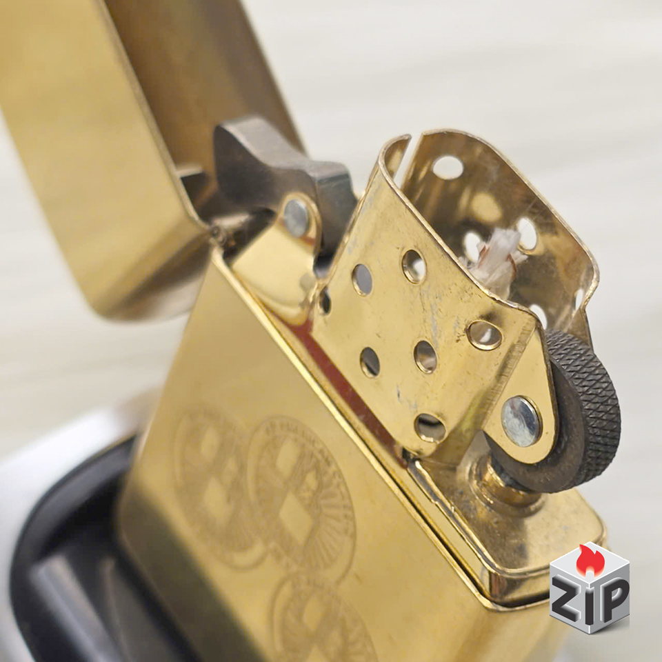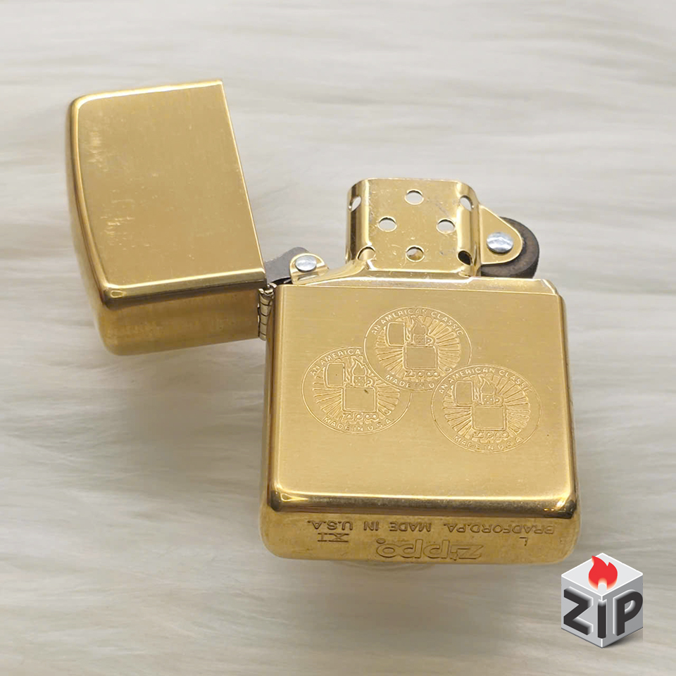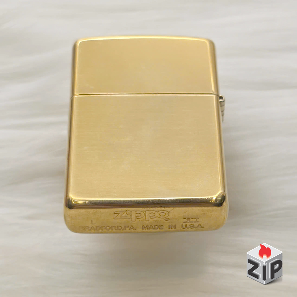 - Kiểu dáng: Zippo tiêu chuẩn (đời la mã – 11 la mã/xi ở đáy), vỏ được giữ nguyên màu vàng đồng, bề mặt được đánh bóng cao (high polish), tạo vẻ ngoài sang trọng và nổi bật.
