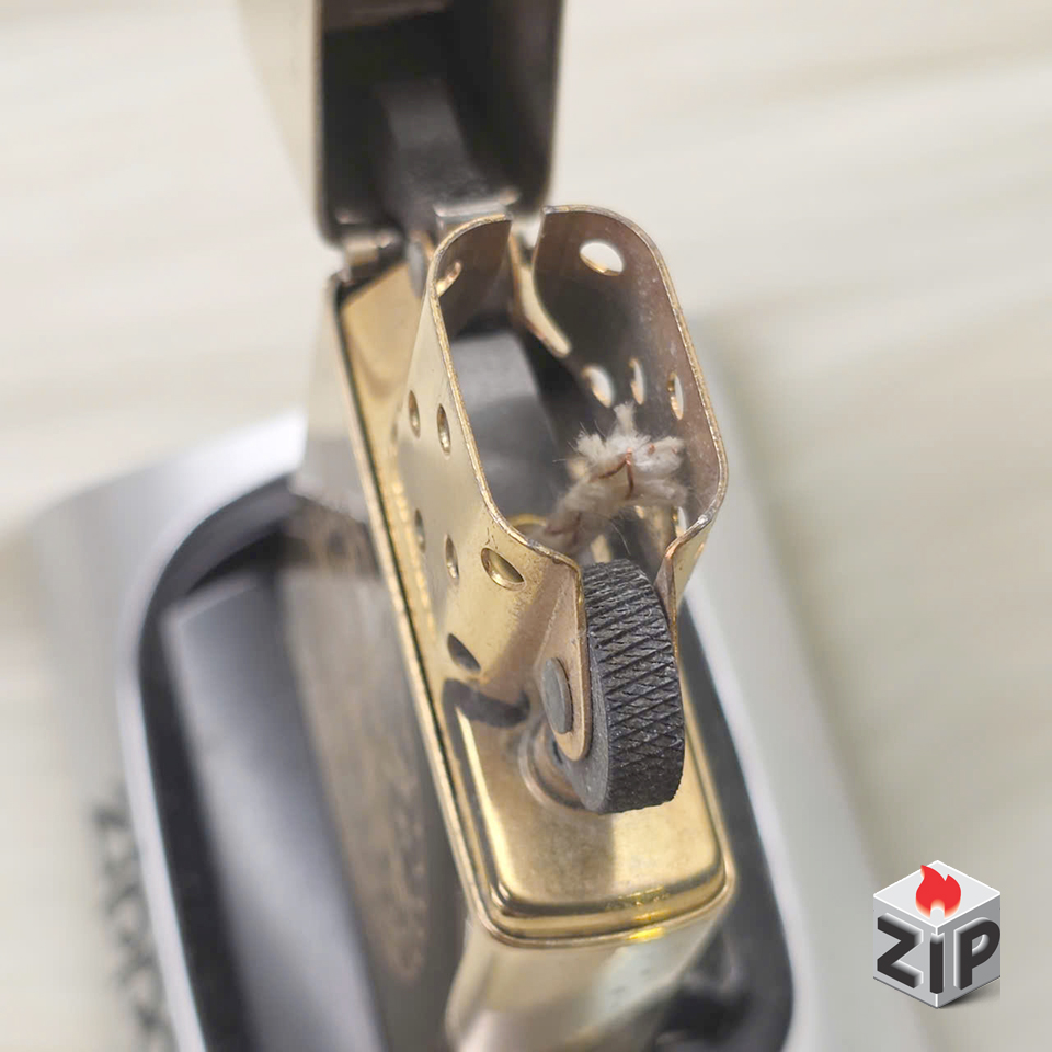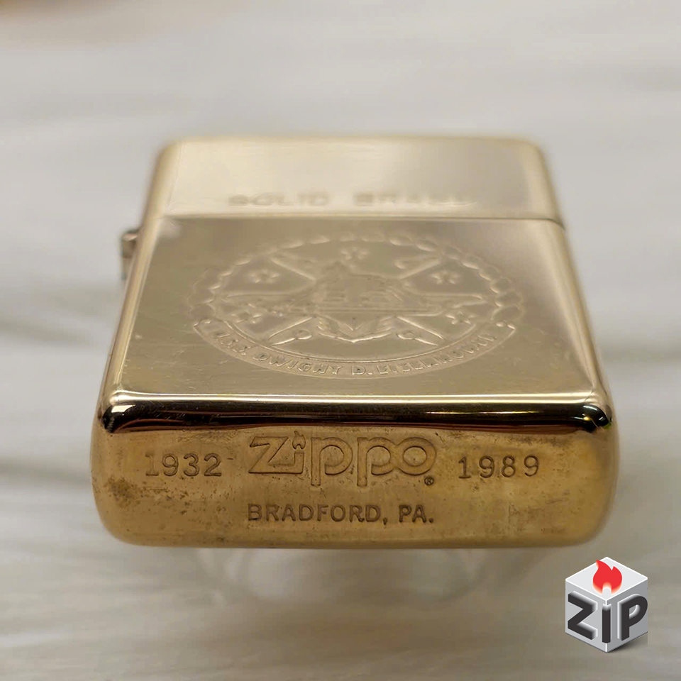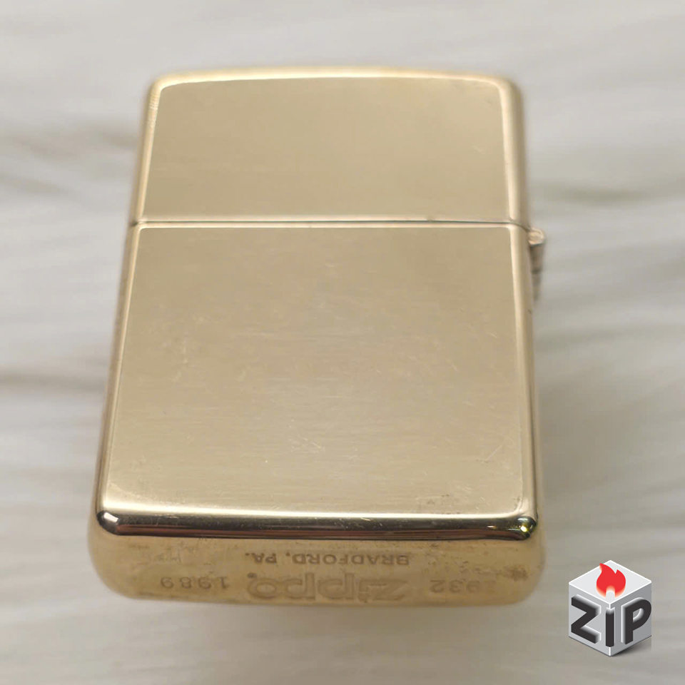 - Kiểu dáng: Zippo tiêu chuẩn (Standard Case), thuộc đời máy cổ điển (ký hiệu 1989 ở đáy – đời 1989 hoặc ngẫu nhiên theo nhà sản xuất). Vỏ được chế tác từ Đồng nguyên khối (Solid Brass) và hoàn thiện Bóng (High Polish – HP), tạo vẻ ngoài vàng sáng, sang trọng và nổi bật.