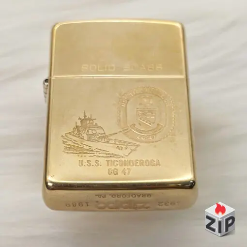 - Họa tiết: Khắc Laser/Ăn Mòn tinh xảo hình ảnh Tàu Tuần Dương U.S.S. TICONDEROGA (CG-47) cùng với Huy hiệu của tàu. Phía trên nắp khắc chữ “SOLID BRASS”. Đáy Zippo có đóng mộc kỷ niệm niên đại 1932 – 1989.