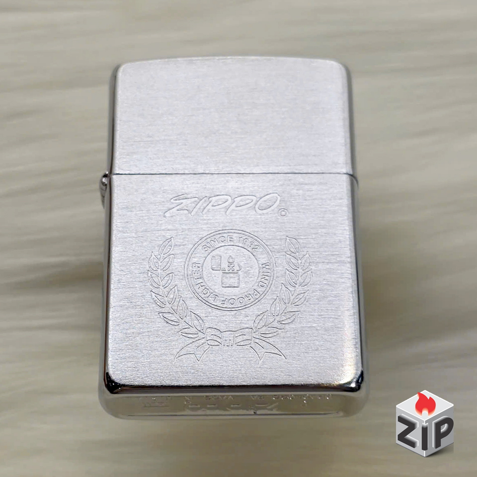 - Họa tiết: Khắc laser/ăn mòn tinh xảo huy hiệu tròn ở trung tâm, bao quanh bởi vòng nguyệt quế. Bên trong huy hiệu có dòng chữ “SINCE 1932” và “WIND PROOF LIGHTER” (Bật lửa chống gió), cùng với logo Zippo lớn phía trên.