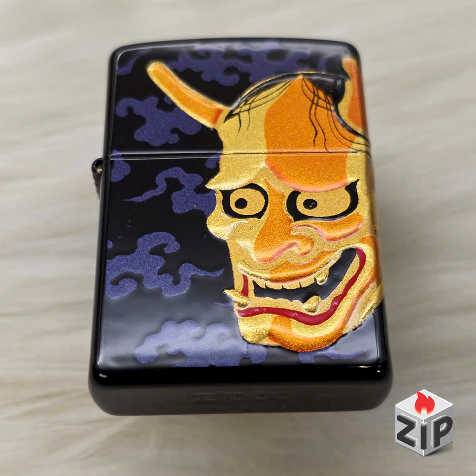 - Họa tiết: Sử dụng kỹ thuật Chạm Khắc/Đắp Nổi kết hợp Sơn Mài (Urushi) để thể hiện hình ảnh Mặt Nạ Hannya (Quỷ Hannya) với màu vàng cam nổi bật và các chi tiết kinh dị sống động. Nền Zippo trang trí bằng họa tiết mây mù (cloud/mist) màu tím huyền bí.