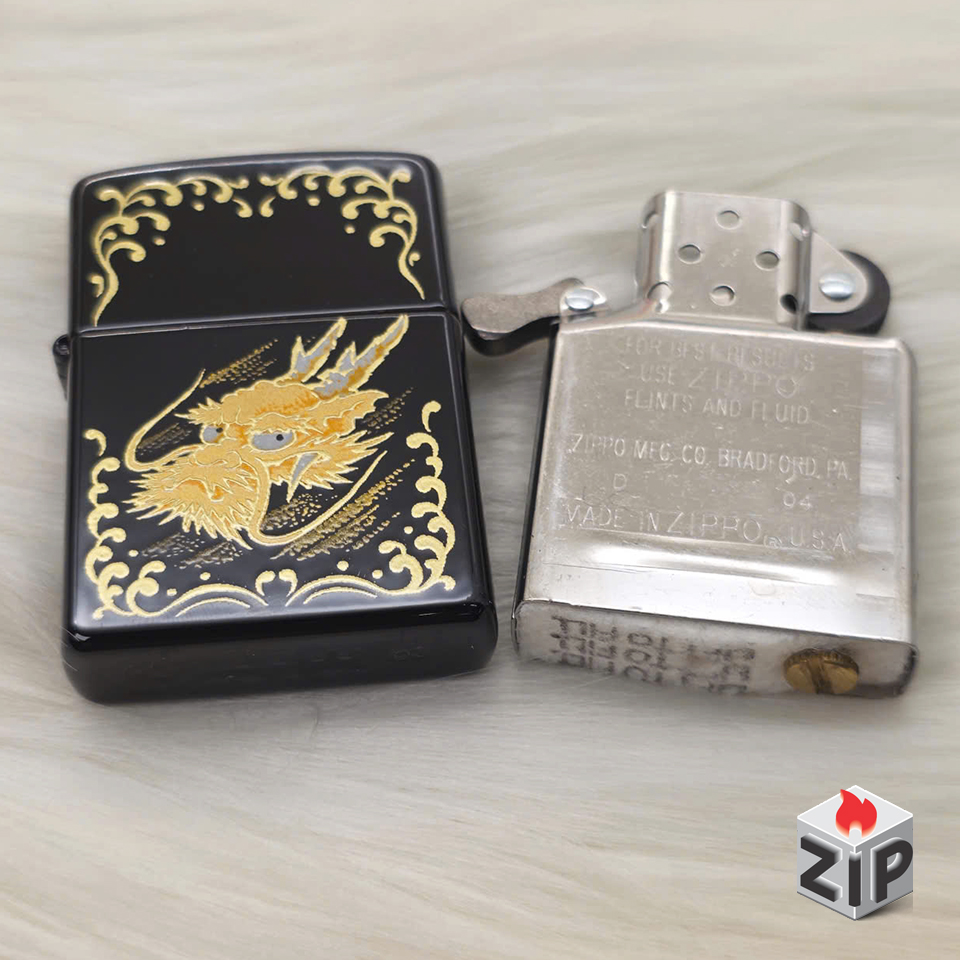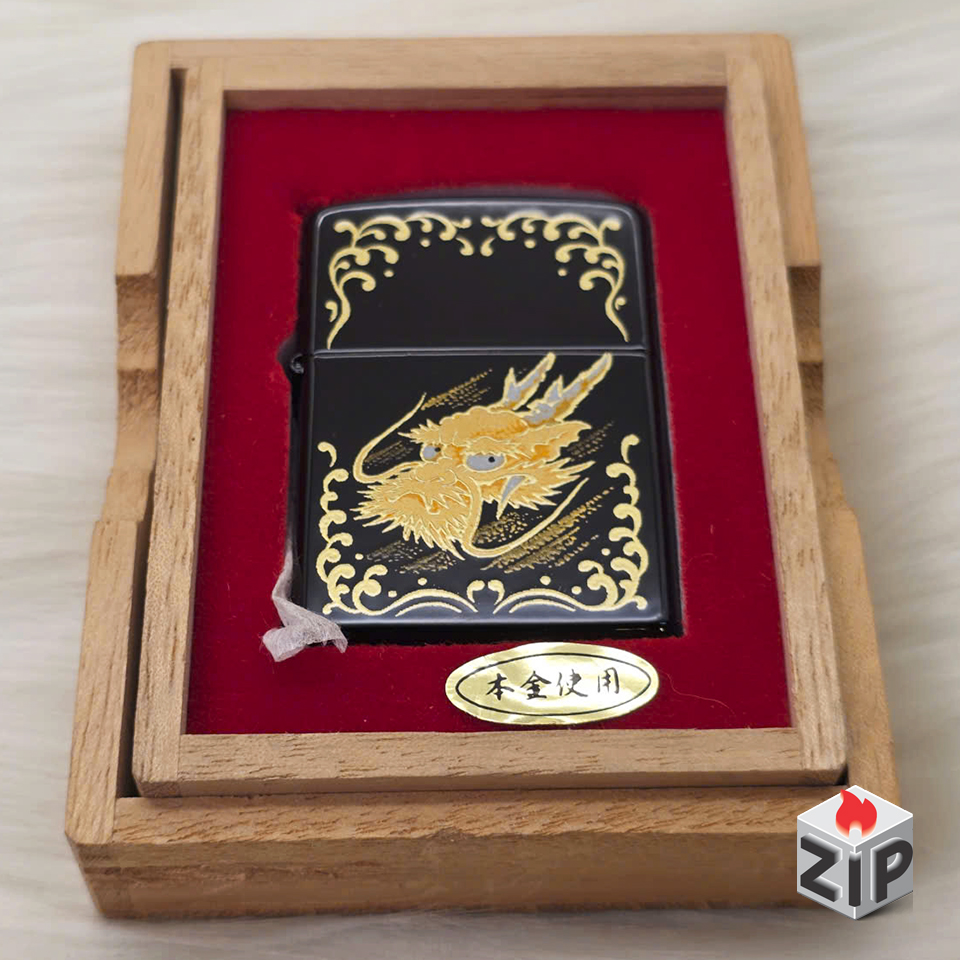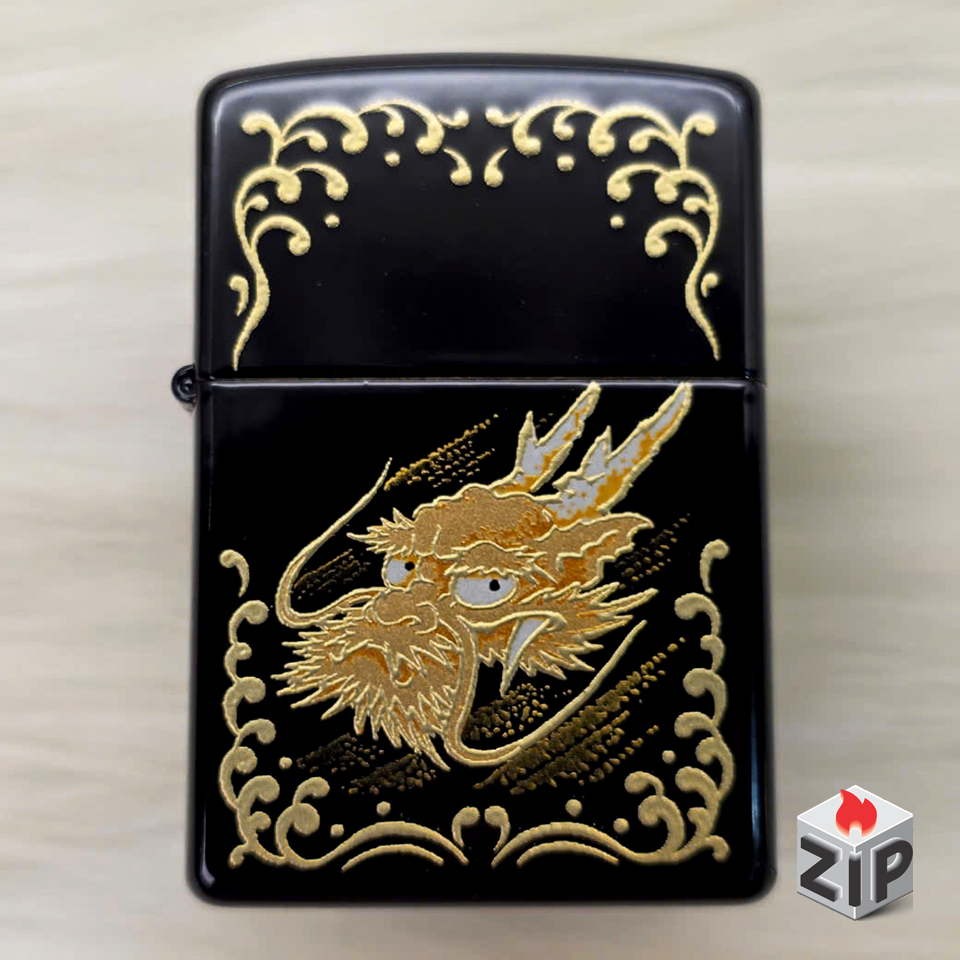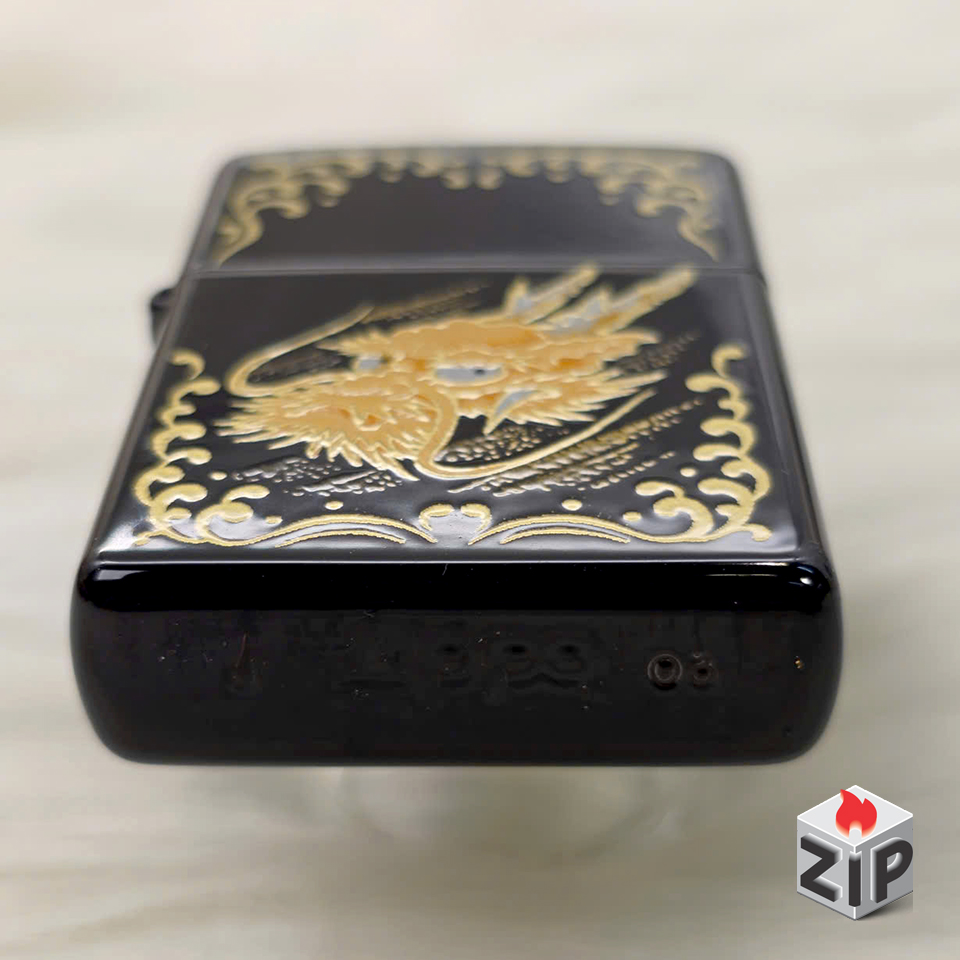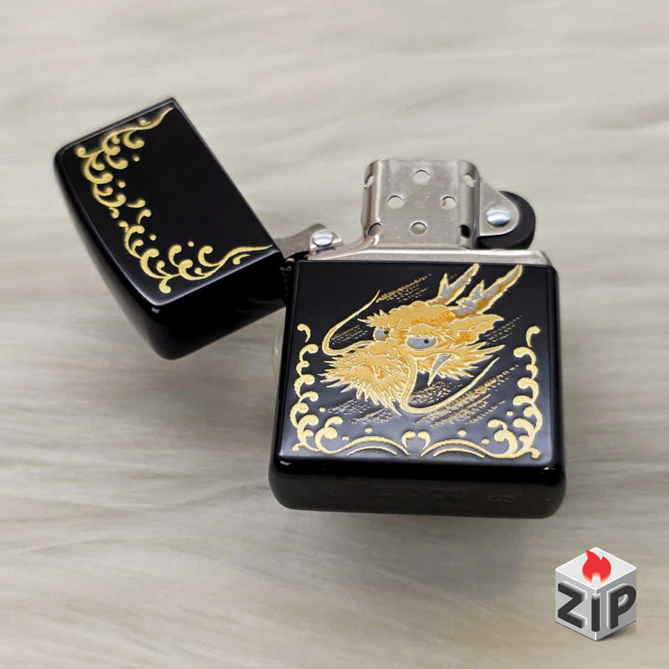 Zippo Khắc Rồng Vàng Sơn Mài Đen Bóng Tài Lộc Xuất Nhật – 2003