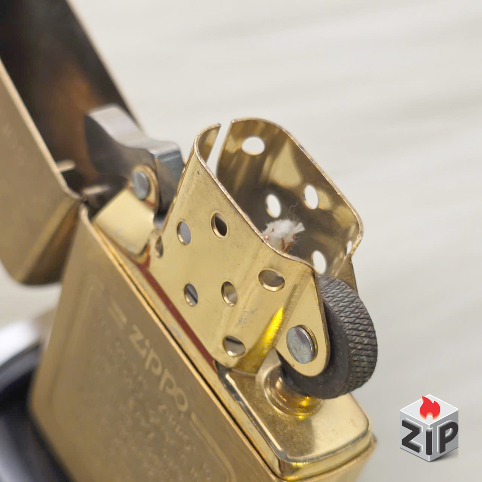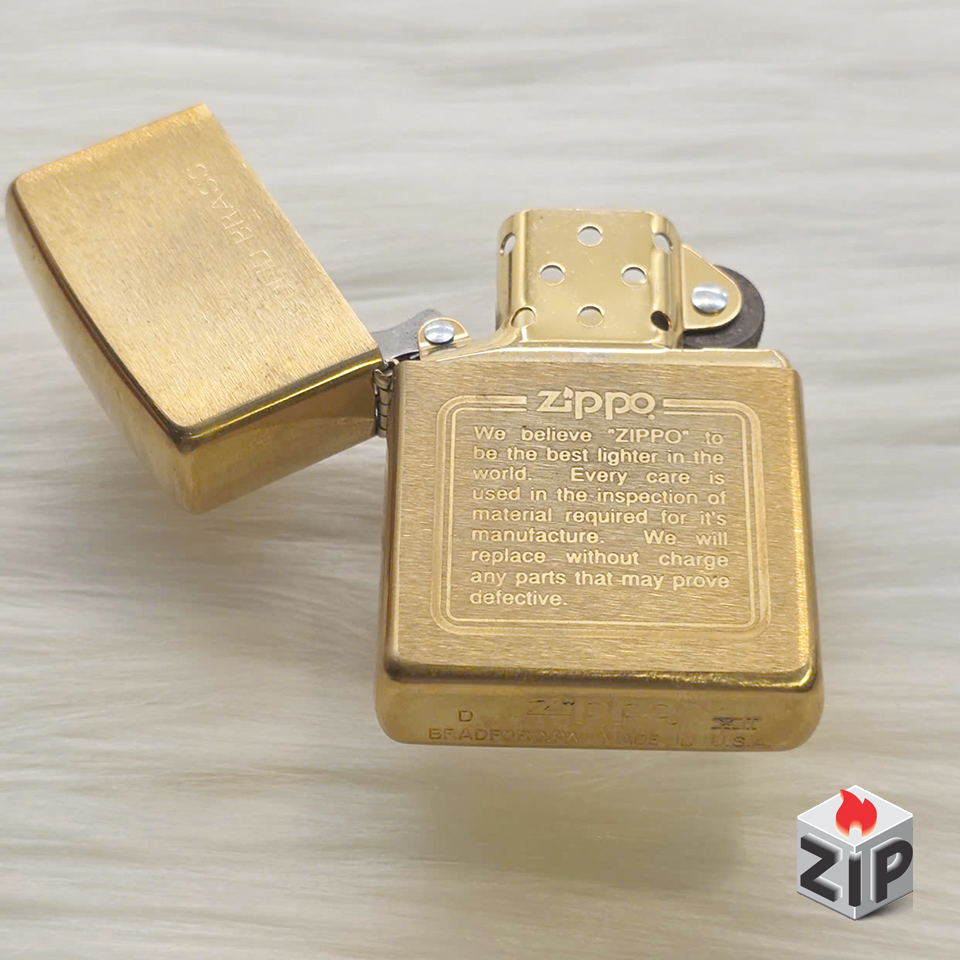 - Kiểu dáng: Zippo tiêu chuẩn (Standard Case), thuộc đời máy La Mã (ký hiệu XII ở đáy – đời 1996). Vỏ được chế tác từ Đồng Khối (Solid Brass) với bề mặt xước ngang (Brushed), mang lại màu vàng sang trọng và vẻ ngoài bền bỉ.