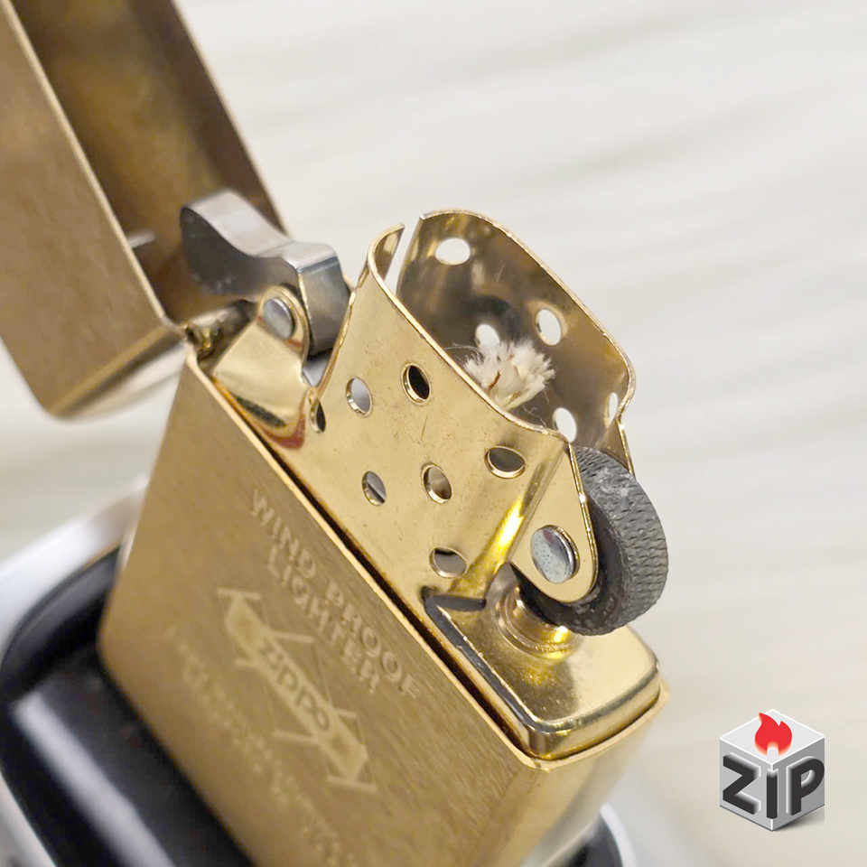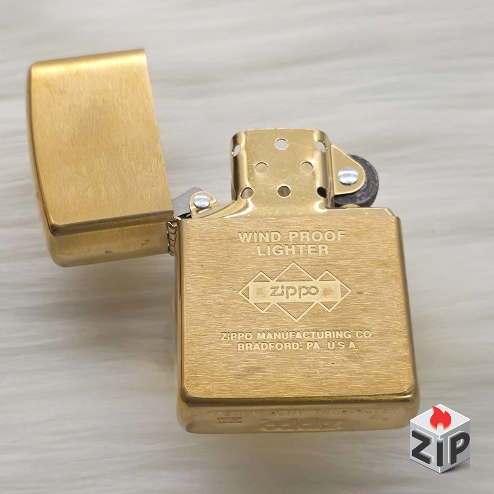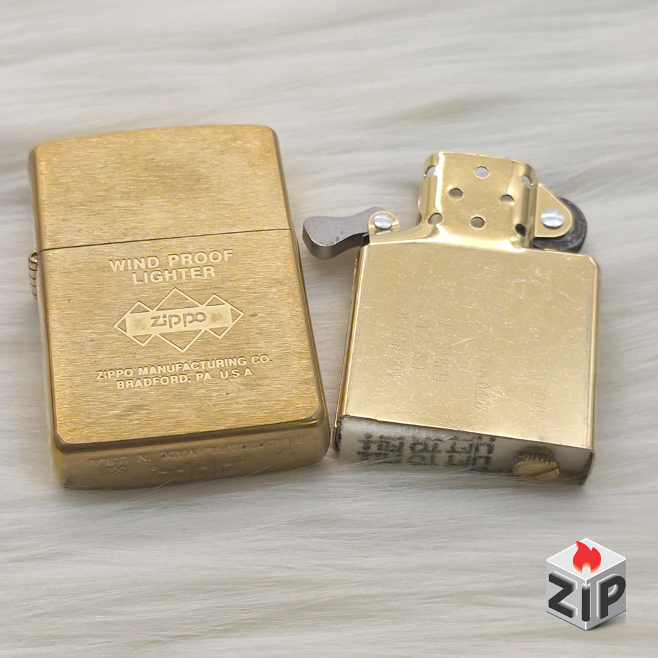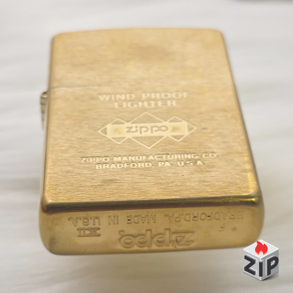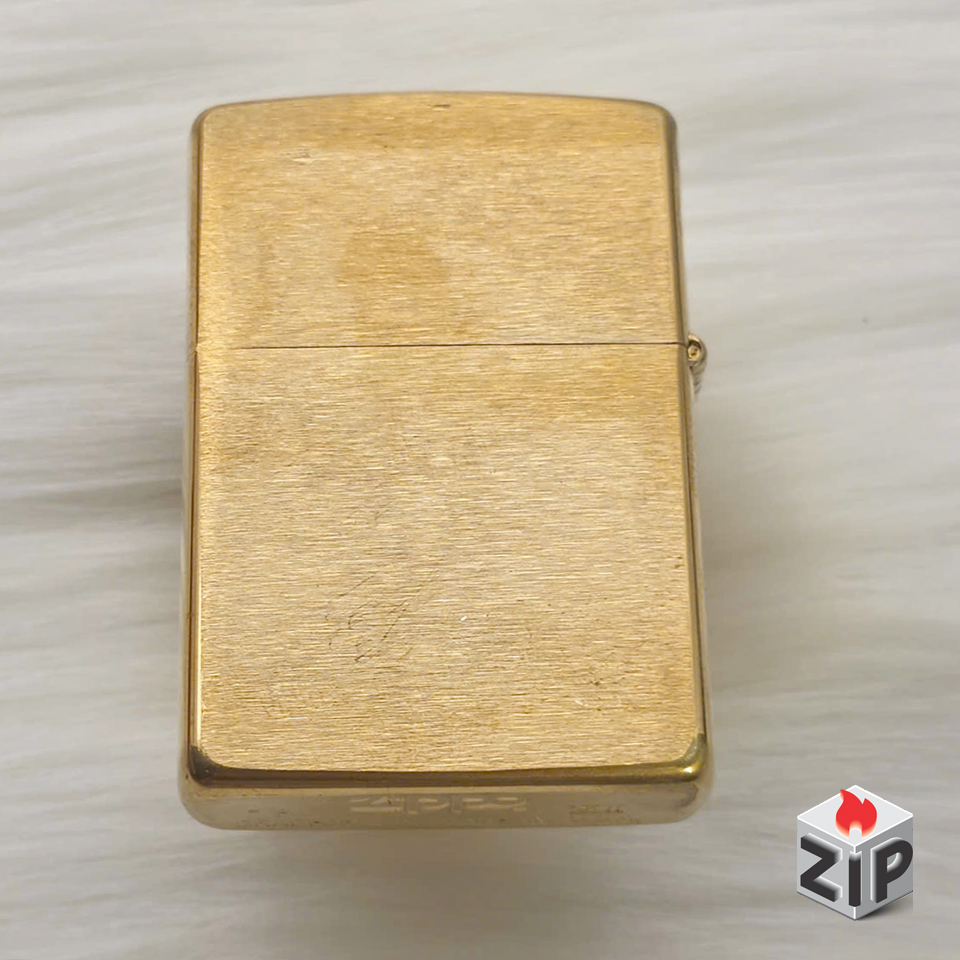 - Kiểu dáng: Zippo tiêu chuẩn (Standard Case), thuộc đời máy La Mã (ký hiệu XII ở đáy – đời 1996). Vỏ được chế tác từ Đồng Khối (Solid Brass) với bề mặt xước ngang (Brushed), mang lại màu vàng cổ điển và sang trọng.