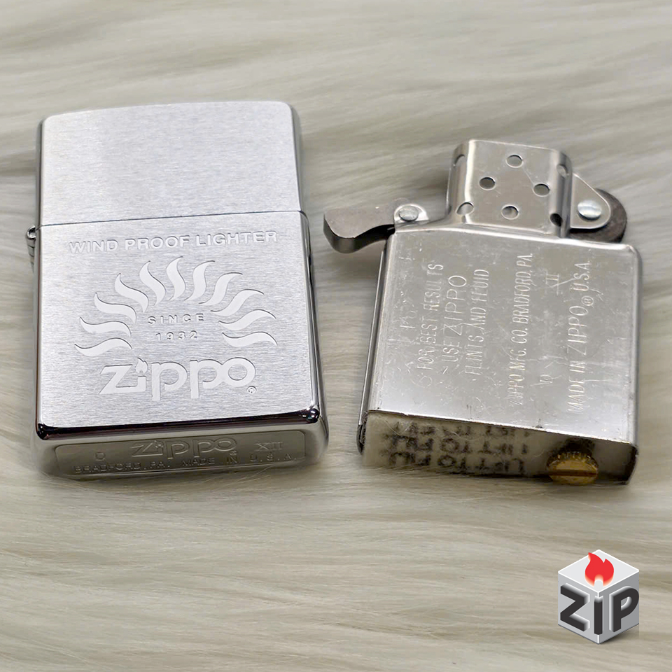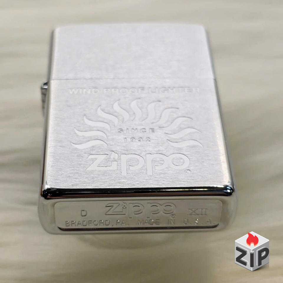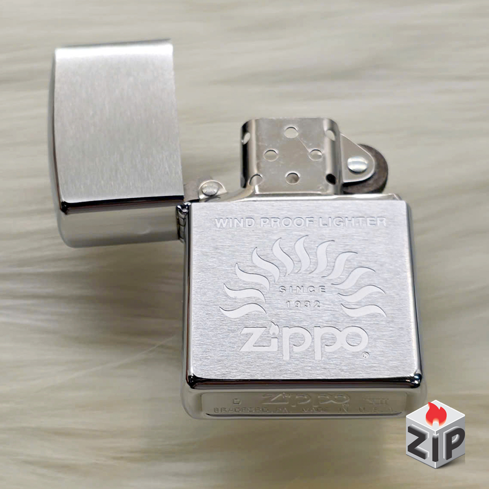 - Họa tiết: Khắc laser/ăn mòn sâu, nổi bật với biểu tượng ngọn lửa cách điệu phía trên logo “Zippo”. Dưới ngọn lửa có dòng chữ “SINCE 1932” và phía trên cùng là dòng chữ “WIND PROOF LIGHTER” (Bật lửa chống gió).