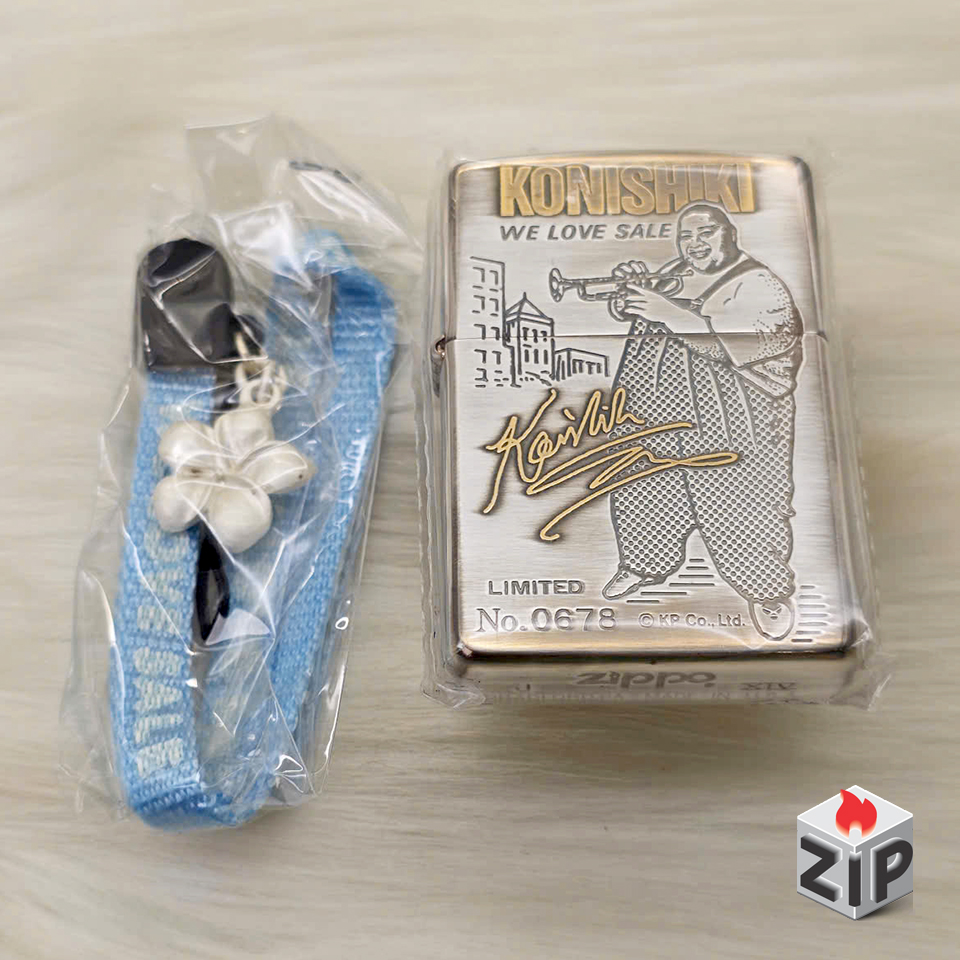 Hộp Đựng & Phụ Kiện: Đi kèm hộp nhung cao cấp màu xanh dương, bên trong có chữ ký Konishiki. Đặc biệt, Zippo đi kèm dây đeo (strap) màu xanh nhạt có gắn hình hoa sứ (hoa Plumeria – biểu tượng của Hawaii, quê hương Konishiki).