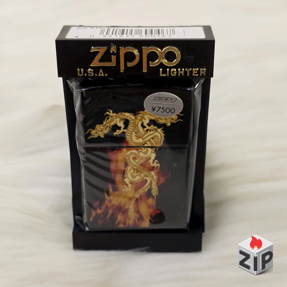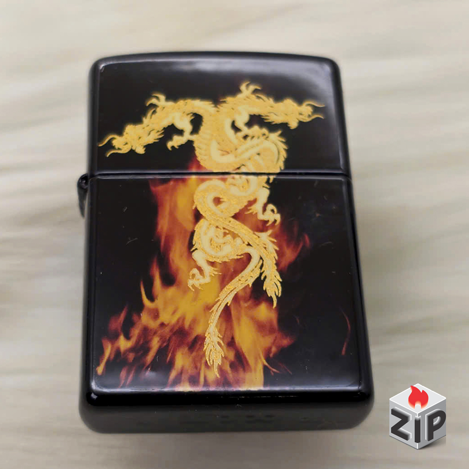 Lửa: Phần dưới thân Zippo là họa tiết Lửa/Ngọn Lửa màu vàng và cam rực rỡ, tạo cảm giác mạnh mẽ và nóng bỏng, như thể Rồng đang bay ra từ ngọn lửa.