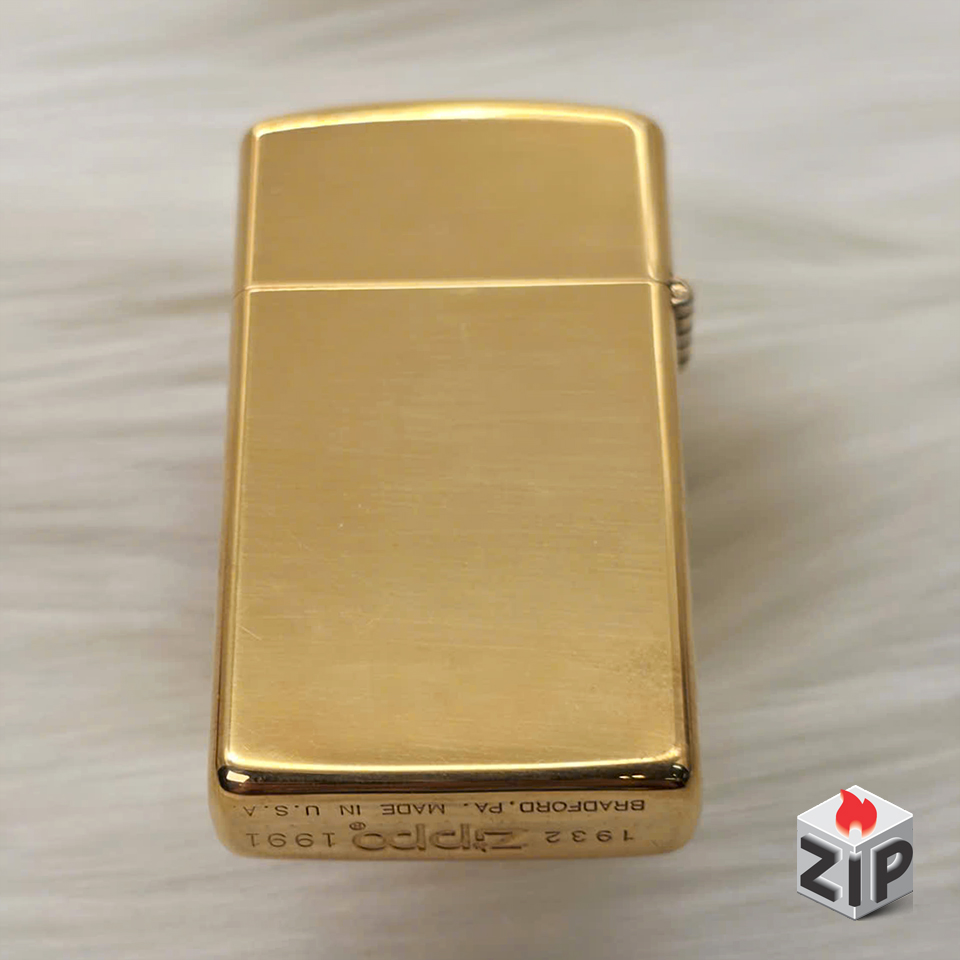 - Kiểu dáng: Zippo tiêu chuẩn (Standard Case), thuộc đời máy cổ điển (ký hiệu 1991 ở đáy – đời 1991 hoặc ngẫu nhiên theo nhà sản xuất). Vỏ được chế tác từ Đồng nguyên khối (Solid Brass) và hoàn thiện Bóng (High Polish – HP), tạo vẻ ngoài vàng sáng, sang trọng và nổi bật.