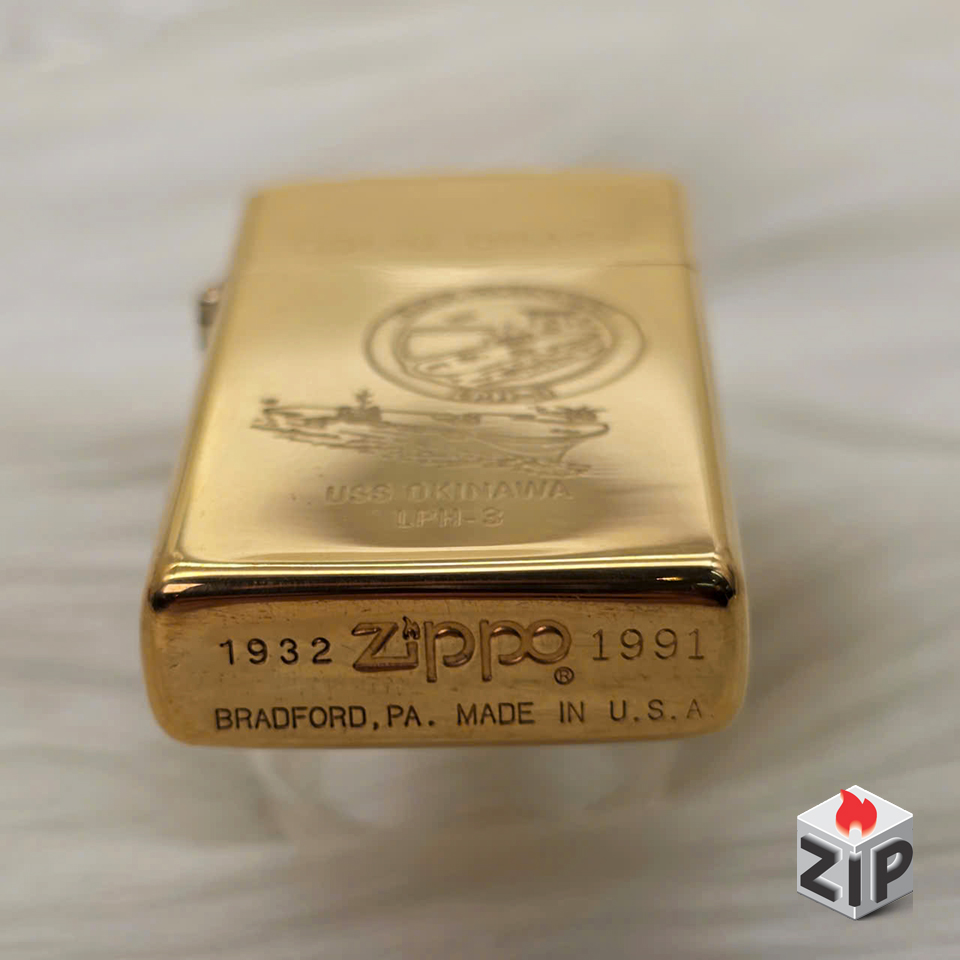 - Họa tiết: Khắc Laser/Ăn Mòn tinh xảo hình ảnh Tàu Đổ Bộ U.S.S. OKINAWA (LPH-3) cùng Huy hiệu của tàu. Phía trên nắp khắc chữ “SOLID BRASS”. Đáy Zippo có đóng mộc kỷ niệm niên đại 1932 – 1991.
