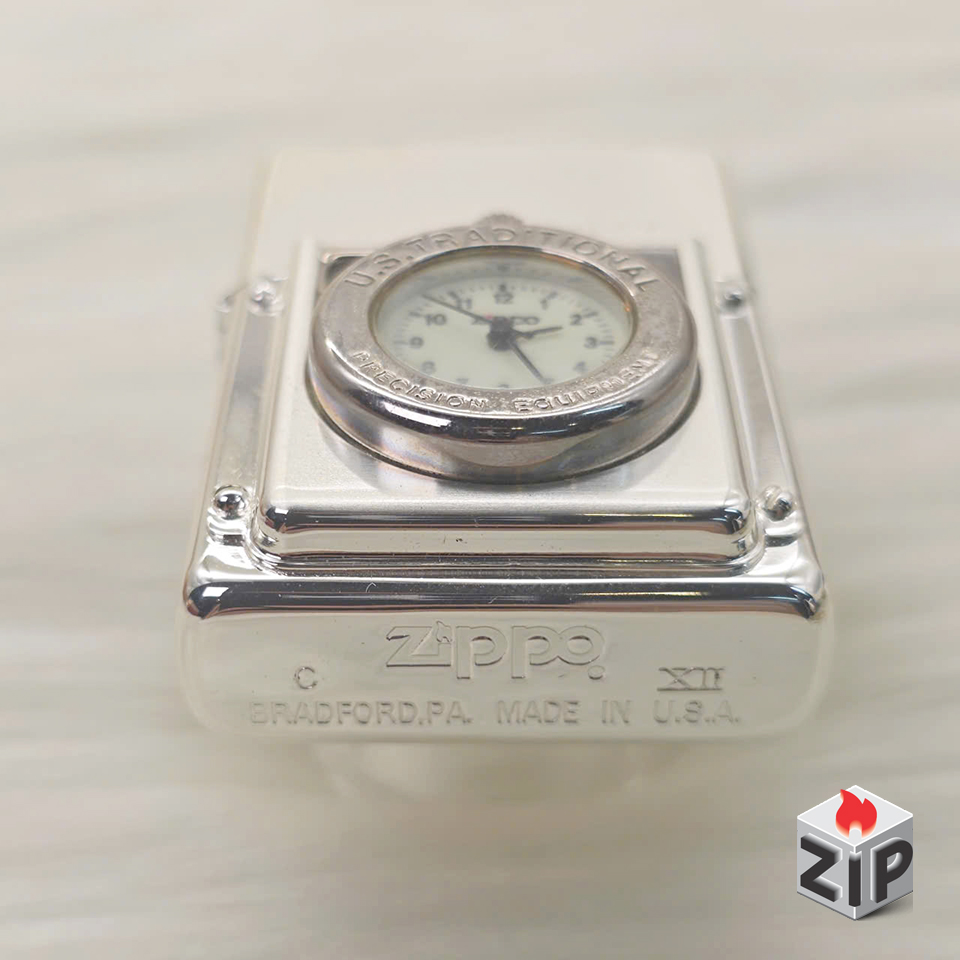 - Họa tiết: Đắp nổi (Emblem) một chiếc Đồng Hồ Cơ Khí hình tròn ở trung tâm thân máy. Mặt đồng hồ màu trắng, có kim và cọc số được phủ lớp Dạ Quang (Luminous) giúp xem giờ trong bóng tối. Nắp Zippo khắc logo Zippo và địa chỉ BRADFORD, PA..